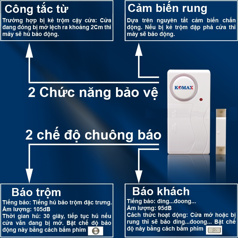 - Nguyên lý hoạt động: 2 chức năng, vừa cảm ứng từ vừa cảm biến rung