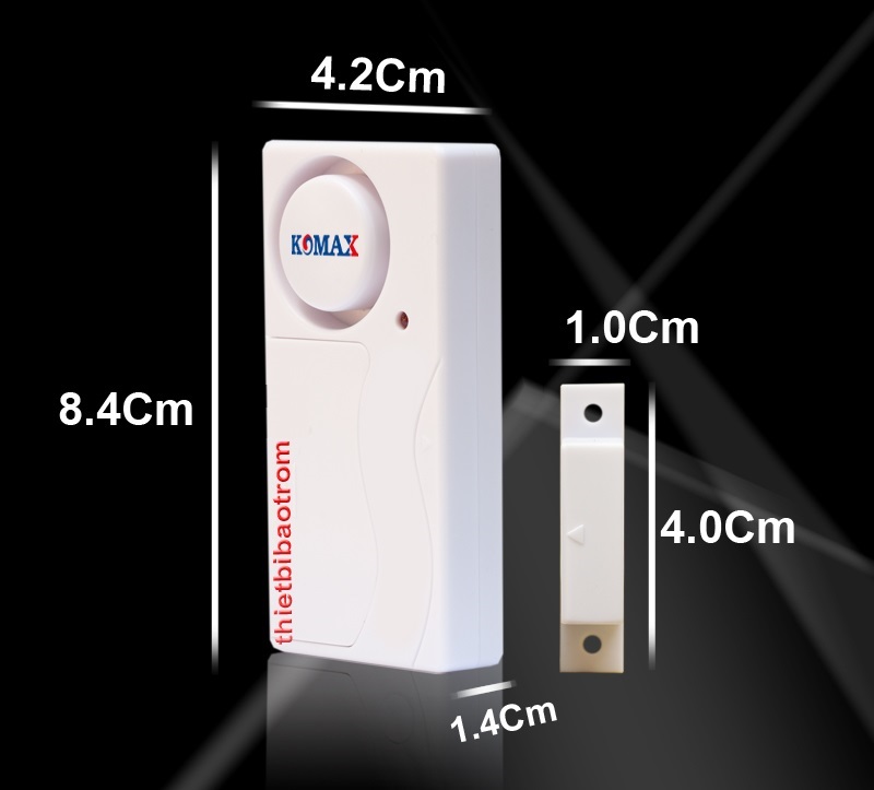 - Kích thước: Bộ phận báo động: cao x rộng x dày: 84 x 42 x 14 mm - Nam châm từ: cao x rộng x dày: 40 x 10 x 11 mm
