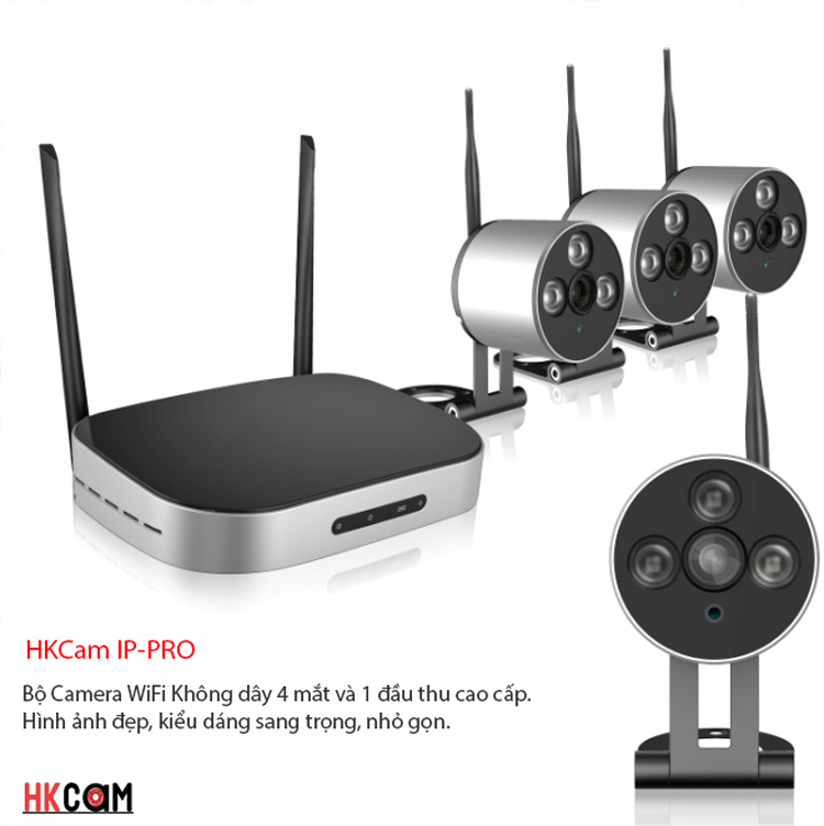HKCam IP-PRO với bộ 4 mắt camera nhỏ gọn và 1 đầu ghi, 100% kết nối không dây.
