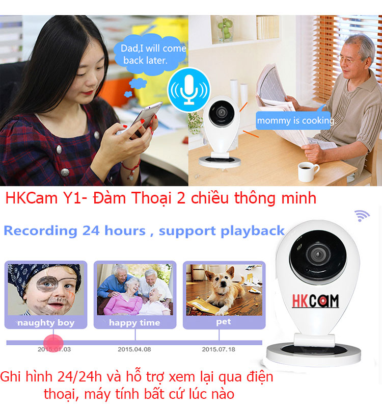 HKcam Y1 hỗ trợ đàm thoại 2 chiều, ghi hình 24/7 và có thể xem lại video ngay trên điện thoại và máy tính mà không cần phải tháo thẻ nhớ ra.