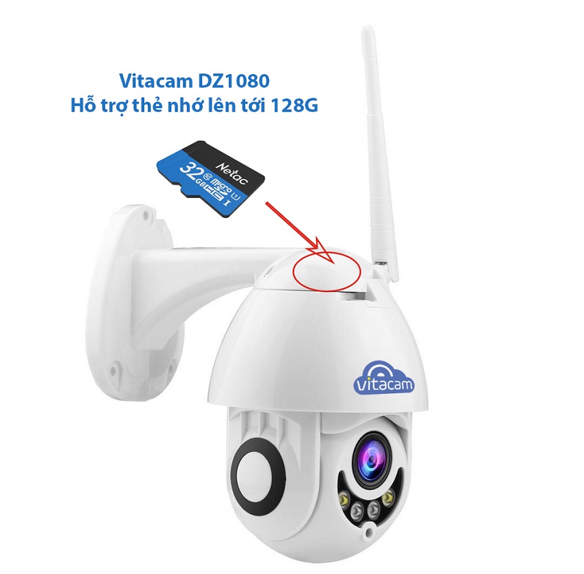 Vitacam DZ1080 hỗ trợ thẻ nhớ gắn thêm lên tới 128G, đây là dòng camera ip Speed Dome PTZ ngoài trời đầu tiên hỗ trợ việc gắn thẻ nhớ lưu trữ rất tiện lợi cho khách hàng lắp đặt và tiết kiệm chi phí đầu ghi và ổ cứng so với camera thông thường.